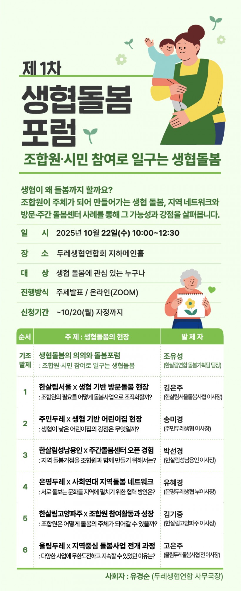 한국 사회에 시행되고 있는 생협 기반 돌봄 활동의 정책적·실천적 의미를 되새기고, 내외부에 실질적 사례를 알림으로써 인지도와 관심도를 제고하고 내부 조합원 참여를 유도하고 생협돌봄의 사회적 확산 기반 마련하기 위하여 생협 돌봄 포럼을 개최합니다.