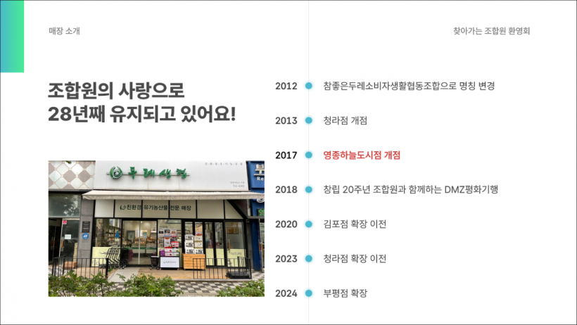 찾아가는 조합원 환영회도 그 의미를 담아 앞으로도 꾸준히 이어갈 예정이에요.