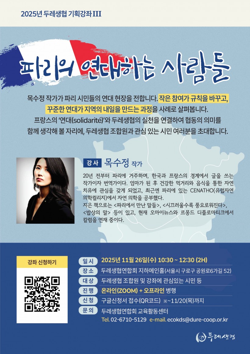 [모집] 2025년 두레생협 기획강좌Ⅲ “파리의 연대하는 사람들” 페이지 정보 작성자 두레지기 작성일25-10-20 10:31 조회34회 댓글0건 목록 본문 두레생협 기획강좌 세번째 시간!!!목수정 작가가 파리 시민들의 연대 현장을 전합니다. 작은 참여가 규칙을 바꾸고, 꾸준한 연대가 지역의 내일을 만드는 과정을 사례로 살펴봅니다.프랑스의 ‘연대(solidarité)’와 두레생협의 실천을 연결하여 협동의 의미를 함께 생각해 볼 자리, 두레생협 조합원과 관심 있는 시민 여러분을 초대합니다.교육문의 : 두레생협연합회 교육활동센터 Tel. 02-6710-5129 E-mail. ecokds@dure-coop.or.kr▶ 강좌 신청하기▶ 강좌 신청하기 목록