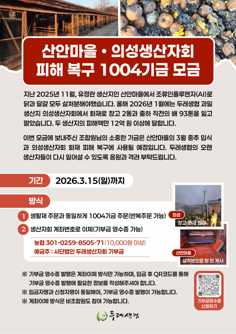[공지] 산안마을,의성생산자회 피해복구 1004기금 모금 > 두레소식