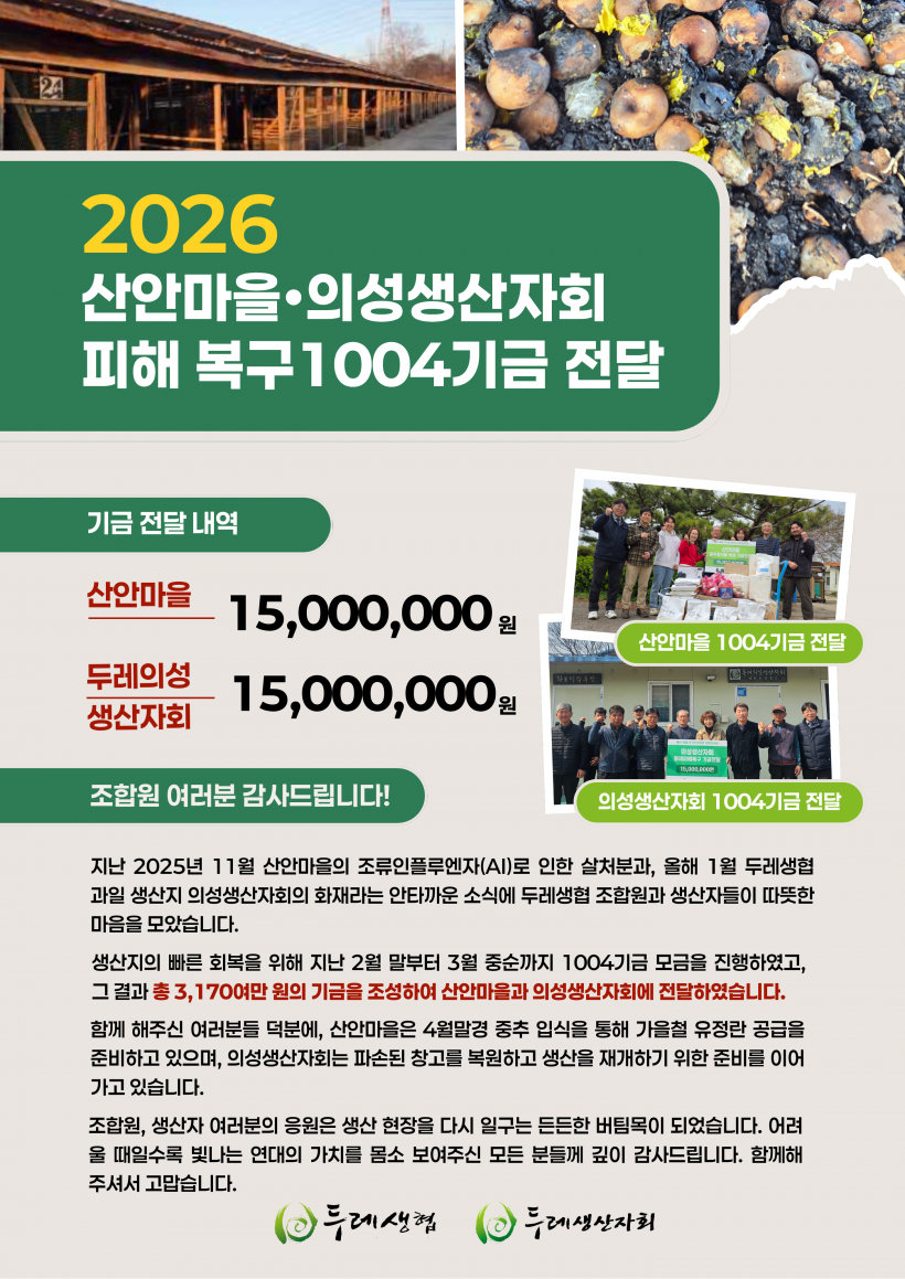 [후기] 2026 산안마을 의성생산자회 피해복구 1004기금 전달 > 두레소식